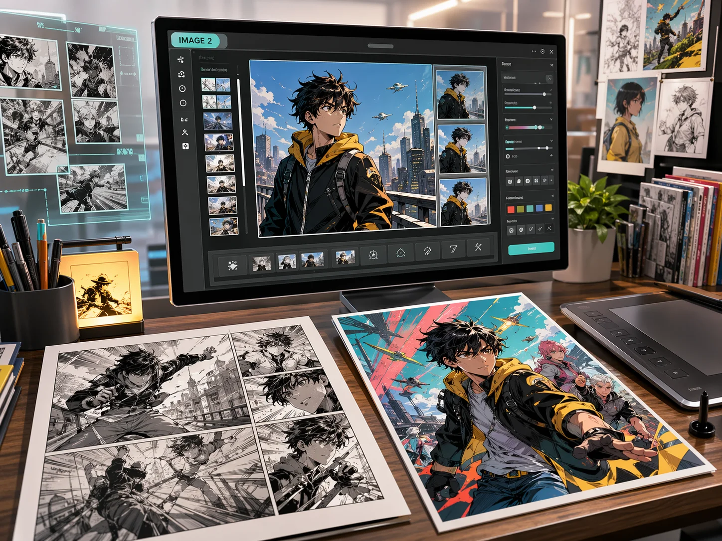 Fresh visual examples for cover art, character setup, panel drafts, editing workflows, and launch campaign assets.