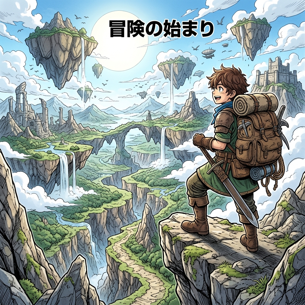 adventure manga style, vast landscape environments, exciting vast atmosphere, professional manga illustration, detailed artworkAdventure Manga Style character portrait