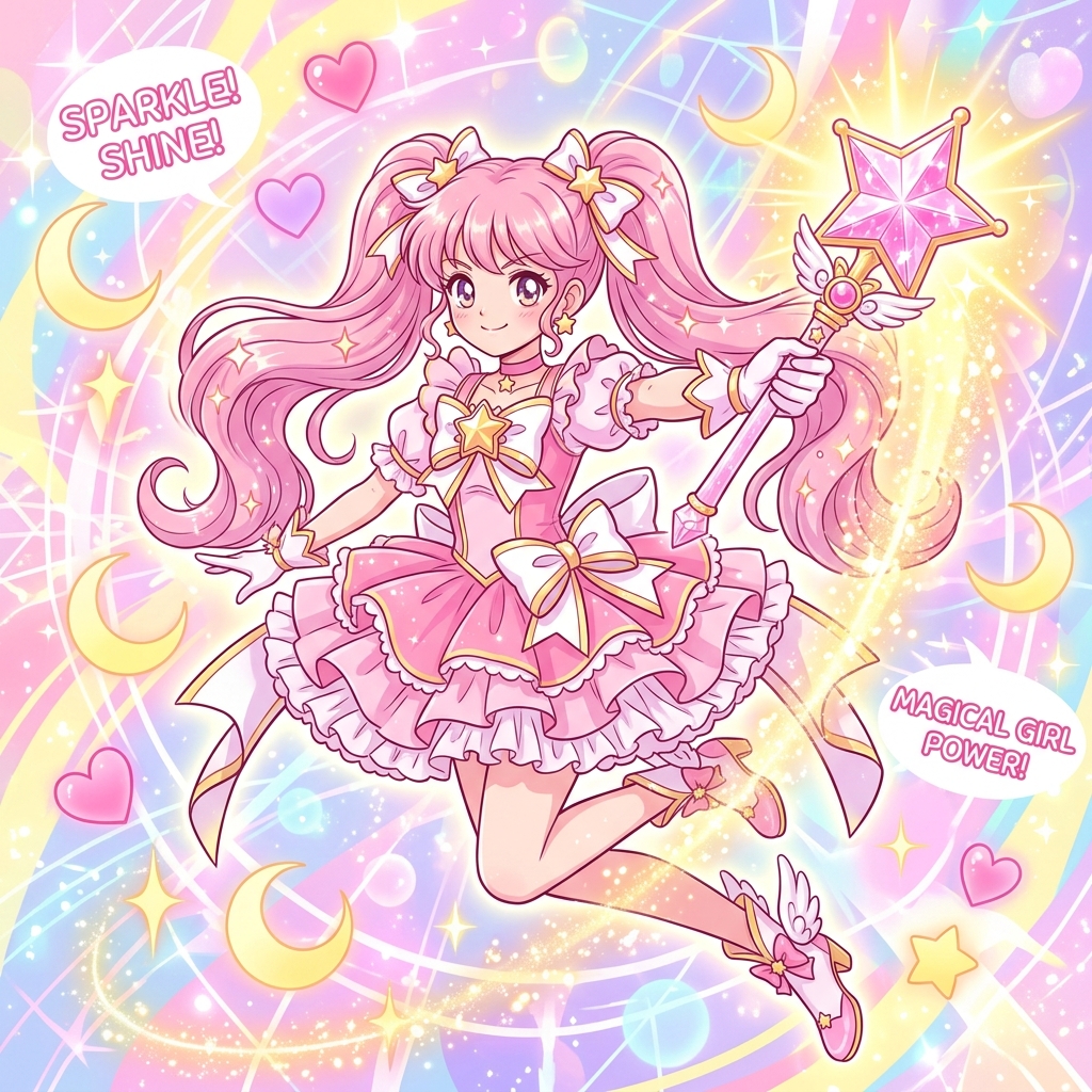 Magical Girl Style stands as an iconic pillar in visual storytelling, instantly recognizable by its magical transformation sequences, elaborate costume designs, wand and magical item details. This specific artistic approach is masterfully designed to evoke sparkly empowering emotions, making it the absolute perfect medium for magical girl transformation narratives.